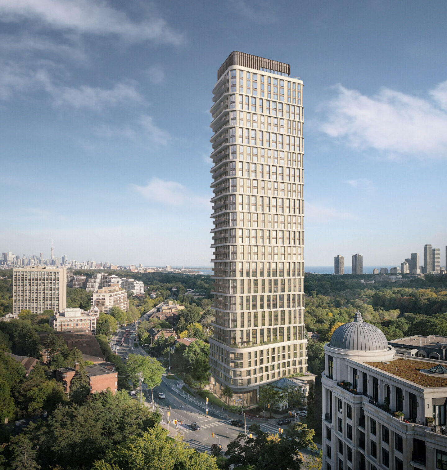 Characterized by restraint, repetition, and rounded edges, this 39-storey condominium sits on one of Toronto’s major streets, adding thoughtful density to a community served by transit and bounded by a ravine system and the Humber River.