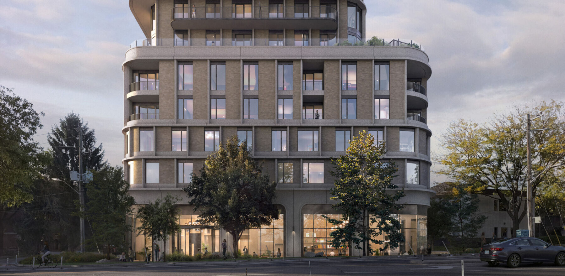 We designed a building in the round that offers sightlines in every direction — toward the Humber River, the Humber Marshes, Parklawn Cemetery, and the downtown skyline — and, conversely, can be appreciated from all sides of the meandering “X” shape that characterizes the larger intersection at Bloor Street West and The Kingsay. The building’s softened edges take inspiration from the winding shores of the nearby river, and the lighter material palette consisting of brick and precast concrete panels brings the building into harmonious conversation with the surrounding urban fabric.