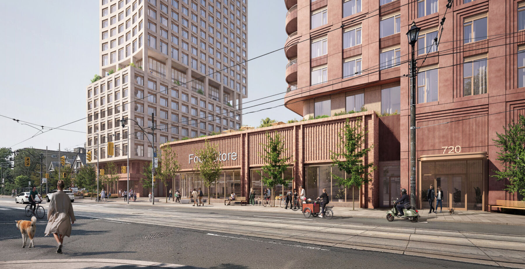 In August 2025, the City of Toronto designated the zone around Broadview and Danforth Avenues a Protected Major Transit Station Area (PMTSA). In response to this PMSTA designation, which recognizes that the existing neighbourhood has the transit infrastructure and population growth to support greater densification, our new mixed-use design proposal for Choice Properties includes two residential towers and a renovated grocery store that serves the larger Danforth community in east-end Toronto.