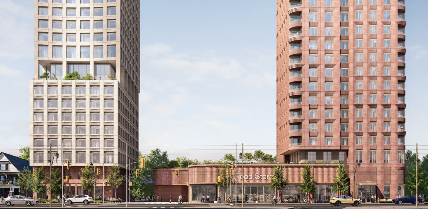 In August 2025, the City of Toronto designated the zone around Broadview and Danforth Avenues a Protected Major Transit Station Area (PMTSA). In response to this PMSTA designation, which recognizes that the existing neighbourhood has the transit infrastructure and population growth to support greater densification, our new mixed-use design proposal for Choice Properties includes two residential towers and a renovated grocery store that serves the larger Danforth community in east-end Toronto.