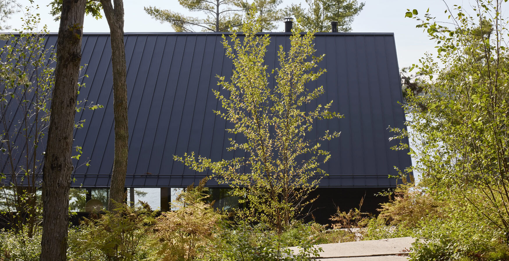 We sited the home very carefully, stitching it into the topography to take advantage of the steep downslope and maximize its physical and visual connections to the land and the lake. Navigating the sharp grade change between the driveway- and lake-facing sides of the property required building a larger roof whose elongated expression simplifies the building’s geometry to accommodate a more spacious program. The roof sits askew to the topographical lines, extending out so far on the northwest side that it appears as though it is practically kissing the ground.