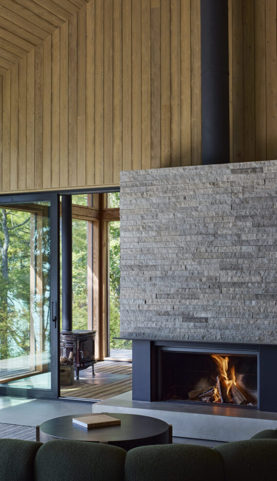 Designed to host big meals and gatherings, the communal space steps down from the entry and is defined by a kitchen with broad prepping and serving surfaces, a long double-width dining-room table, extensive white oak millwork, and eastern white pine boards on the walls and ceiling. A statement fireplace made of granite with a custom concrete hearth pulls focus in the otherwise open and expansive space, picking up on the grey large-format tile and finishes in the kitchen. The living room is adjacent to a screened-in porch with a small wood-burning stove for the shoulder seasons, while an operable glass façade draws lake views into the shared areas. The entry level includes the principal bedroom, ensuite bathroom, and a modest home office, the second floor houses four bedrooms and a shared bathroom, and the lower level includes a bedroom that opens out to a firepit that sits steps above the lake.