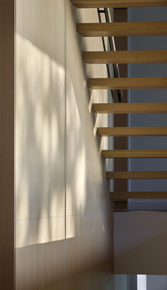 On the approach from the driveway, a sweeping roof appears as if it is almost emerging from the earth. A generous dormer protrudes from the roof structure, adding space to create bigger footprints for the children’s bedrooms on the second floor and bathing them in light. A strategically placed ribbon of windows on the ground-floor below the overhang offer direct views through the home out to the lake. The glazed reveal introduces translucency, helping to create the impression that the roof is hovering above the ground.
