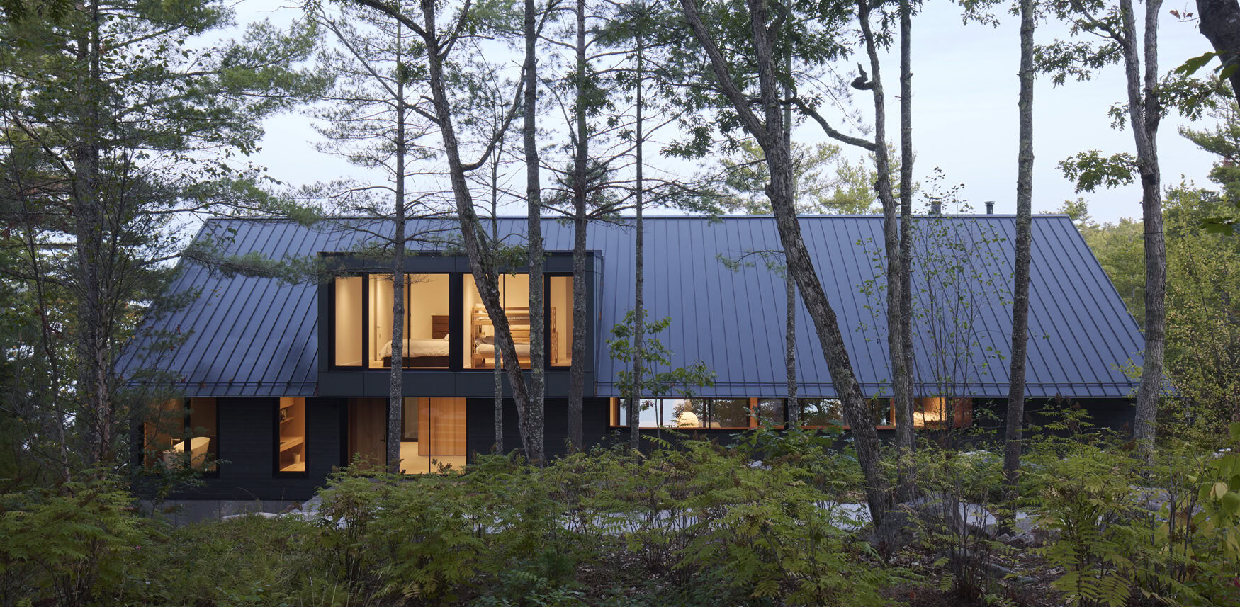 Designed for hosting friends and family, this spacious split-level cottage in the Kawartha Highlands navigates a rocky hillside to immerse its occupants in nature and invite the lake into the house.